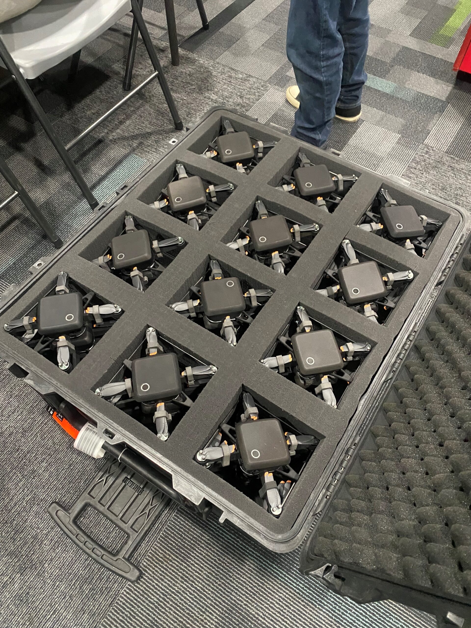 Our drones are small, battery operated, with ultra bright LED lights. They are reused via rechargeable batteries.